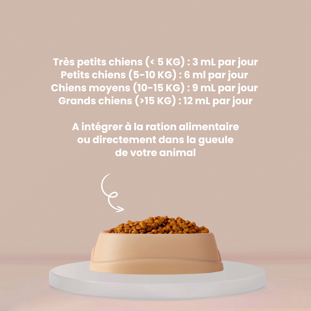 Conseils d’utilisation : Agiter avant emploi. 3 mL par jour avec la seringue doseuse, par tranche de poids de 5 KG. A intégrer à la ration alimentaire ou directement dans la gueule de votre chien. A conserver au réfrigérateur après ouverture et à consommer rapidement. Précautions d’emploi : Cet aliment complémentaire ne doit pas remplacer l’alimentation équilibrée de votre chien. Ne pas dépasser la dose quotidienne recommandée. Si votre chien est actuellement sous traitement médicamenteux, veuillez consulter votre vétérinaire avant utilisation. Ne pas donner d’aliments complémentaires si votre animal est en gestation ou en lactation. Ne pas donner aux très jeunes animaux.