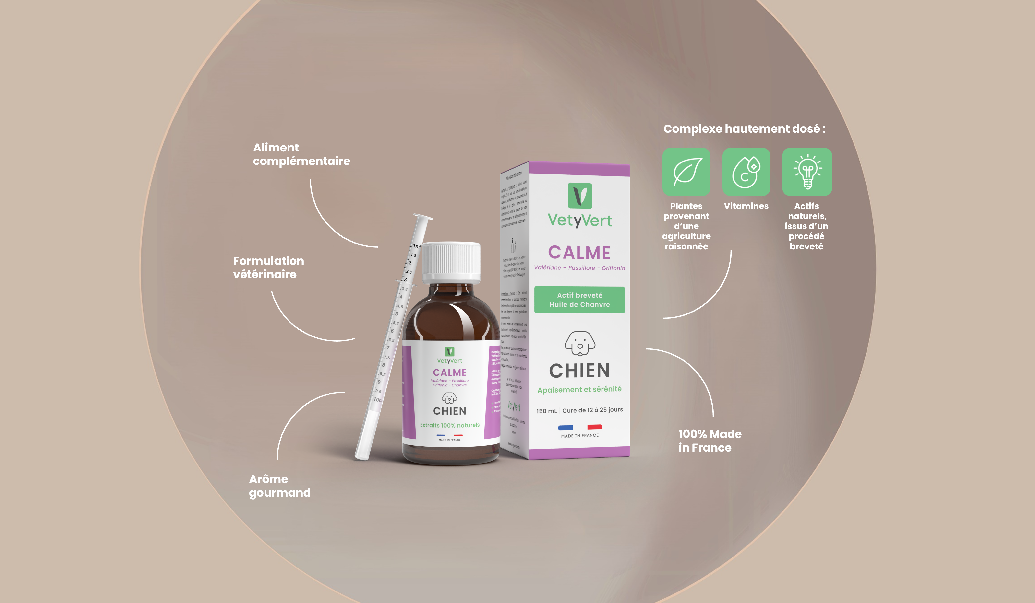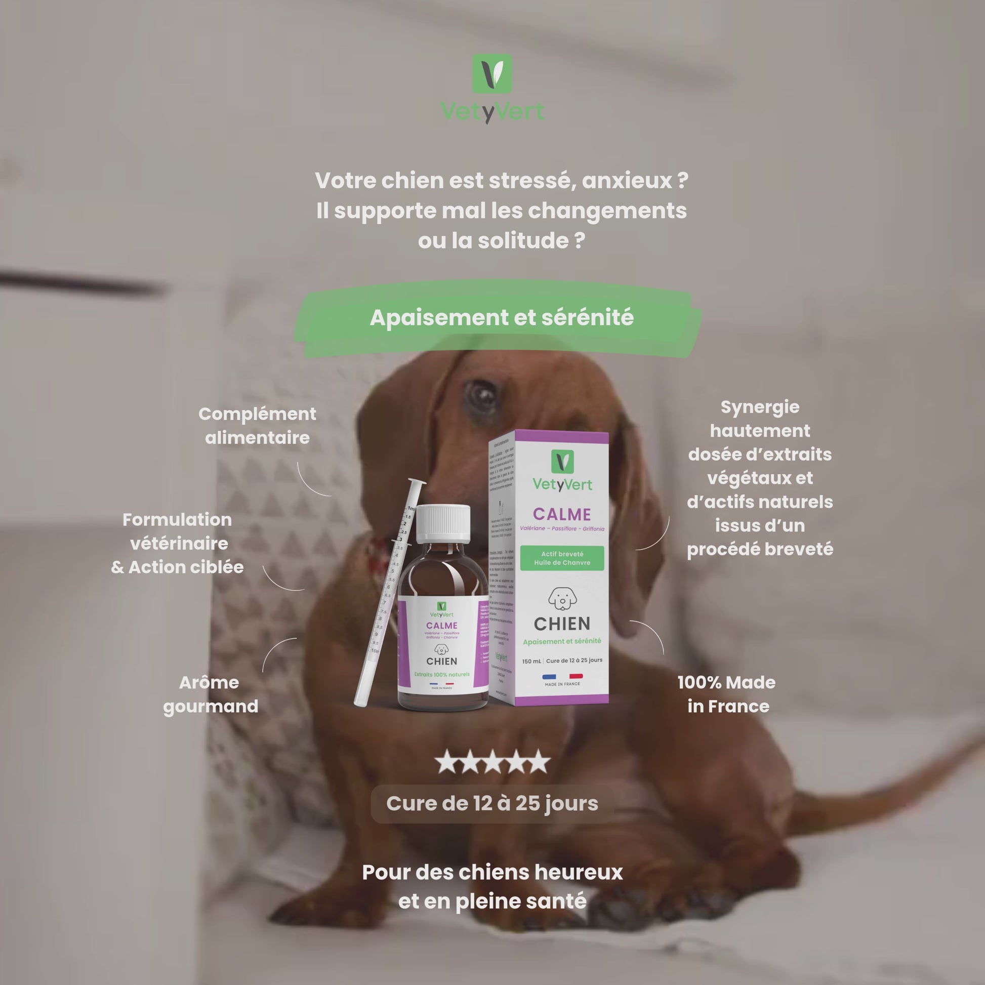 Le complexe Calme de VetyVert procure naturellement apaisement et sérénité à votre chien anxieux. Au cœur de sa formule : une combinaison inédite et hautement dosée d’actifs associant des extraits naturels de plantes, de la vitamine C et de l’huile végétale de chanvre.