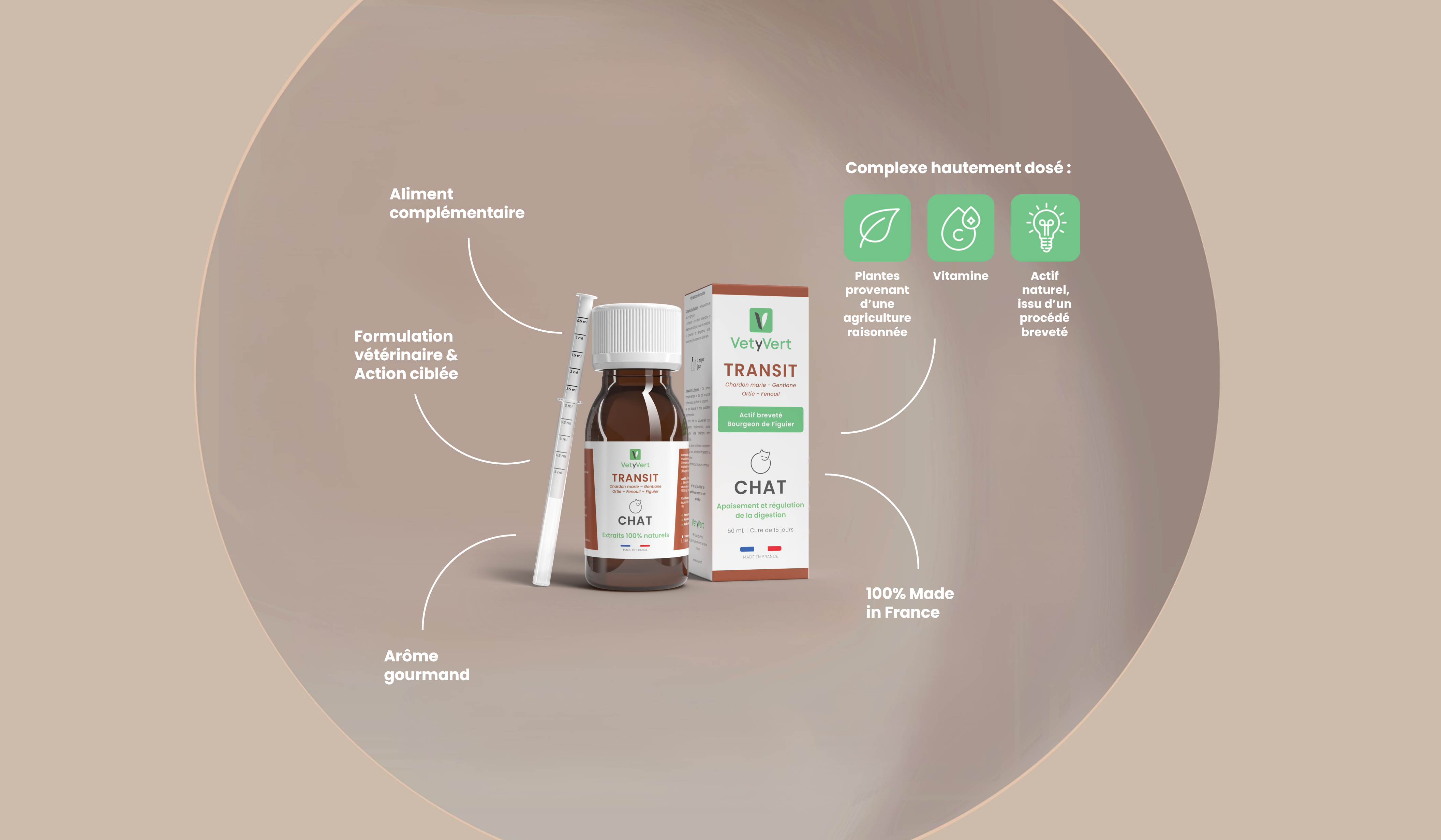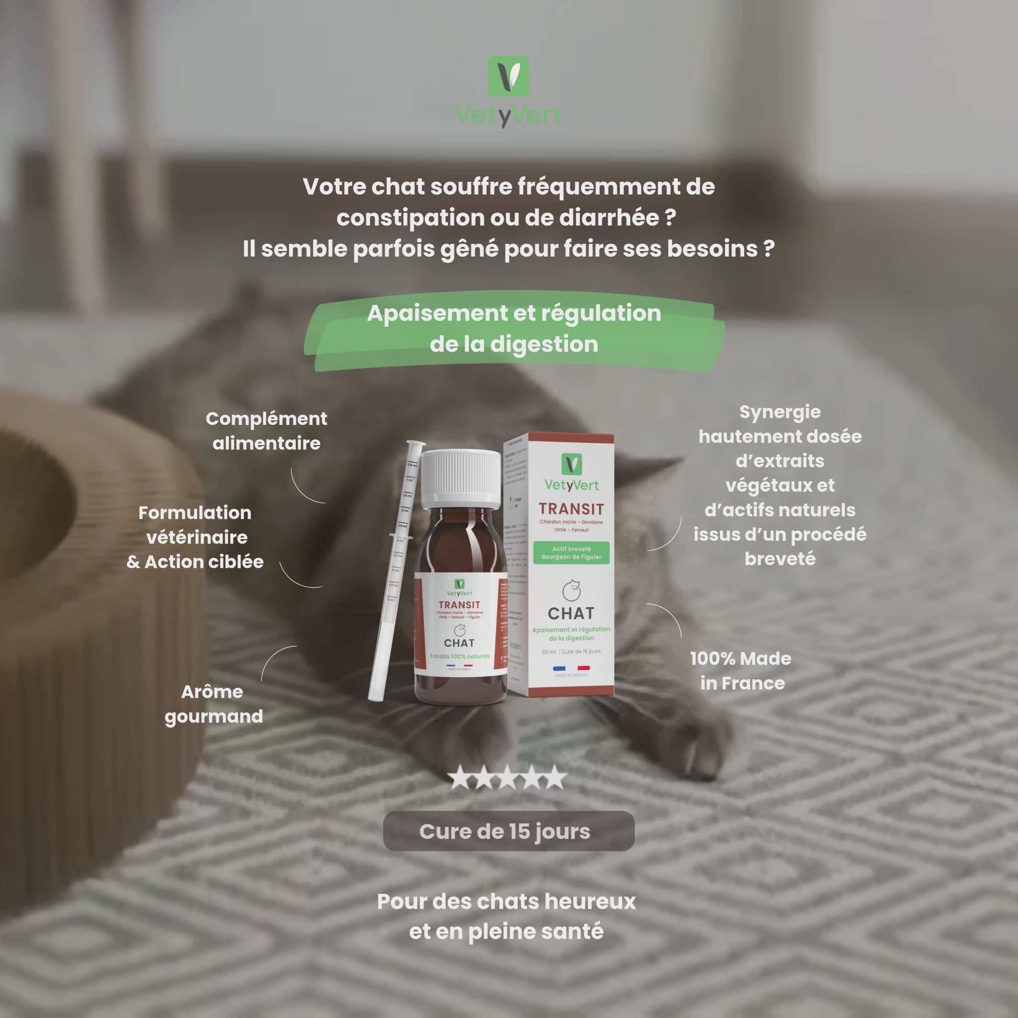 Flatulences, transit paresseux ou à l’inverse trop rapide : le complexe Transit de VetyVert va naturellement réguler la digestion de votre chat. Son secret : une combinaison inédite et hautement dosée d’actifs associant des extraits naturels de plantes, de la vitamine C et des bourgeons de figuier.
