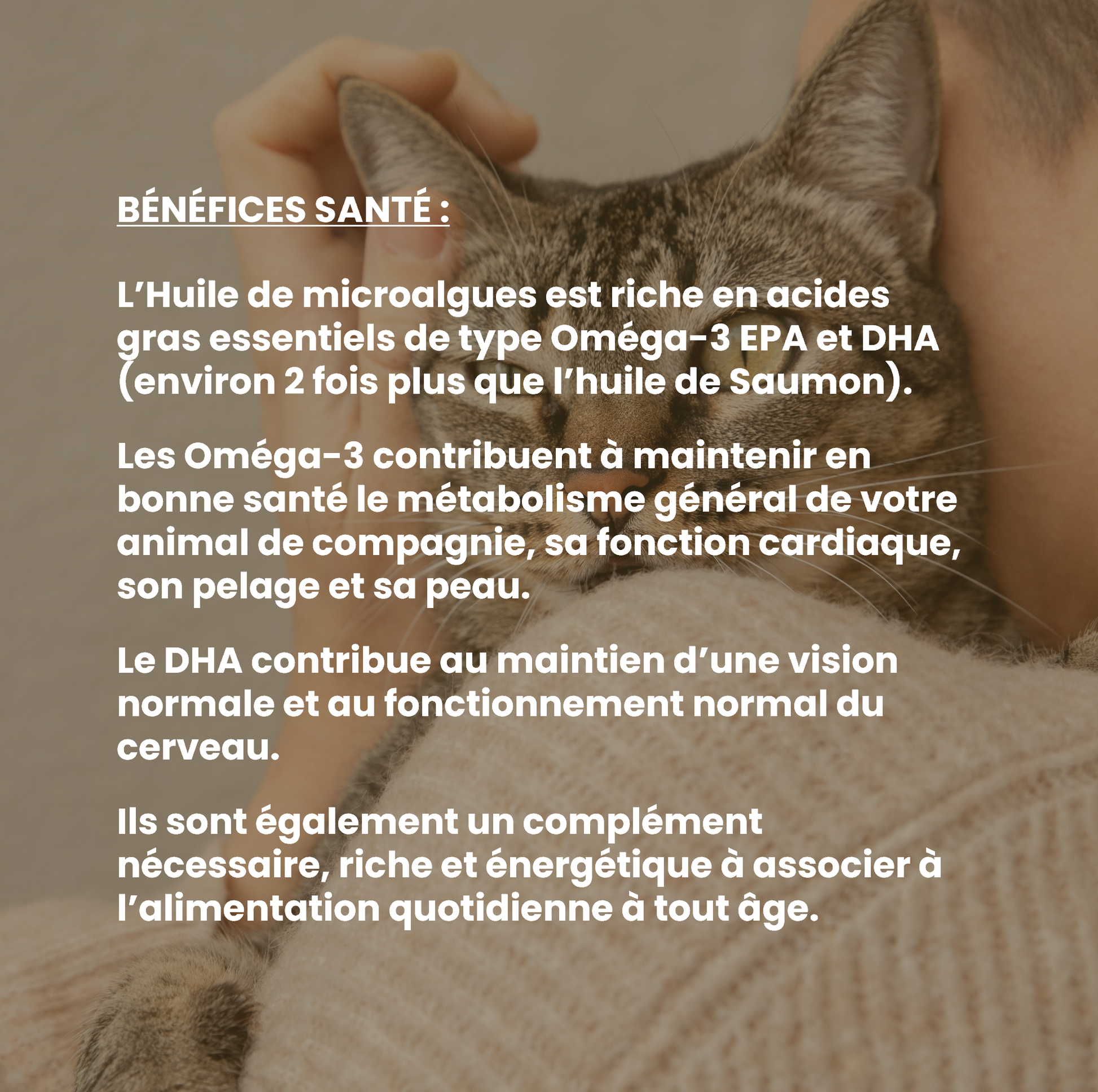 L’Huile de microalgues, issue de Schizochytrium sp., est riche en acides gras essentiels de type Oméga-3 EPA et DHA (environ 2 fois plus que l’huile de Saumon). Les Oméga-3 contribuent à maintenir en bonne santé le métabolisme général de votre animal de compagnie, sa fonction cardiaque, son pelage et sa peau. Le DHA contribue au maintien d’une vision normale et au fonctionnement normal du cerveau. Ils sont également un complément nécessaire, riche et énergétique à associer à l’alimentation quotidienne à tout âge.