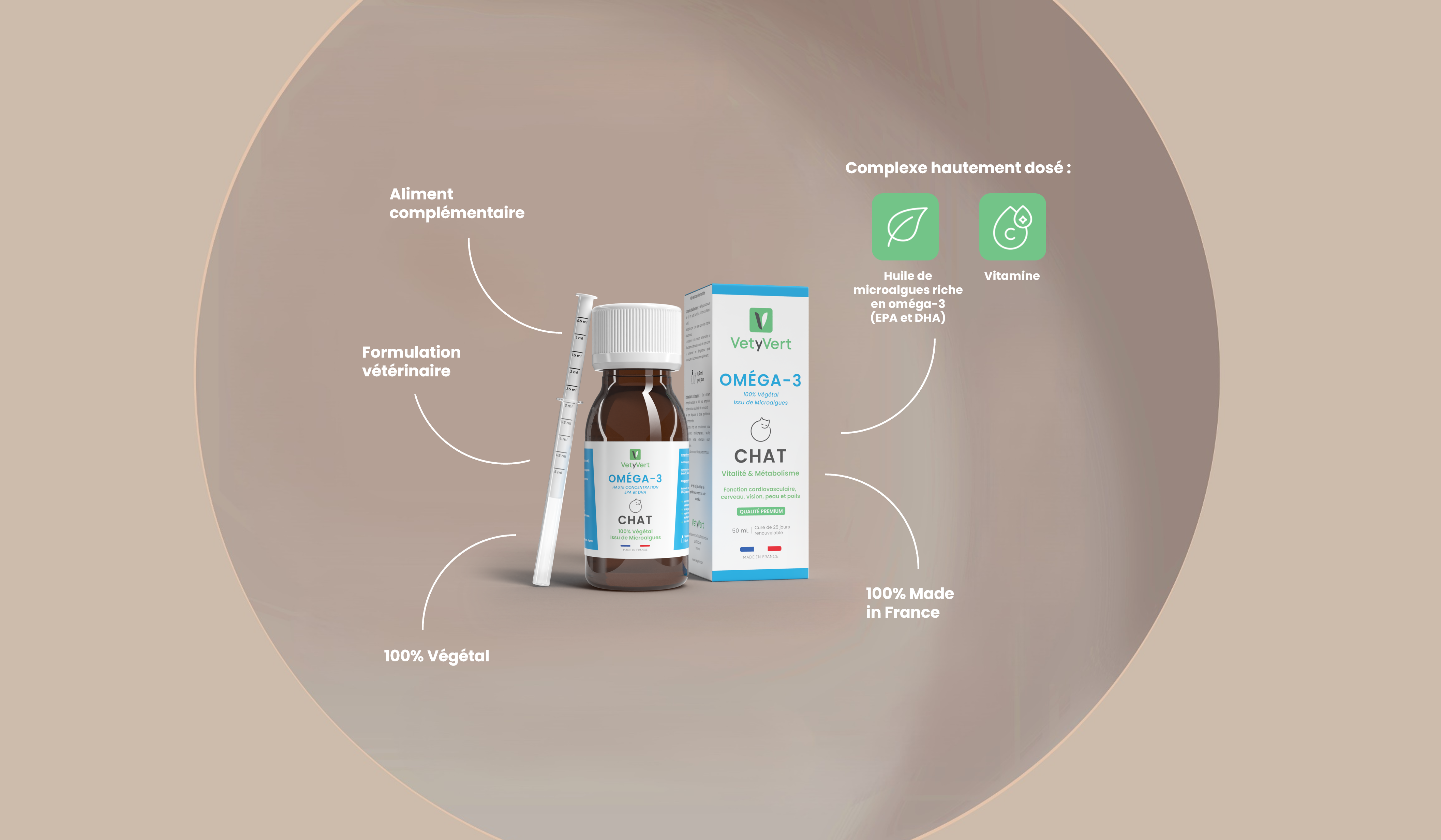 L’huile de microalgues VetyVert est très riche en acides gras essentiels de type Oméga-3 EPA et DHA (entre 65 et 70% de plus d’oméga 3 et de DHA que l’huile de saumon par exemple). Les Oméga-3 contribuent à maintenir en bonne santé le métabolisme général de votre chat, sa fonction cardiaque, son pelage et sa peau. Le DHA contribue au maintien d’une vision normale et au fonctionnement normal du cerveau. Un indispensable pour accompagner au quotidien votre animal et préserver sa santé naturellement le plus longtemps possible. À utiliser sous forme de cure, à raison d’un flacon par cure. Les cures peuvent être espacées de plusieurs semaines si nécessaire. En cas d’animal en surpoids : n’hésitez pas à solliciter votre vétérinaire pour ajuster la dose en fonction des conditions de santé de votre chat.